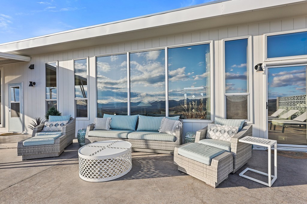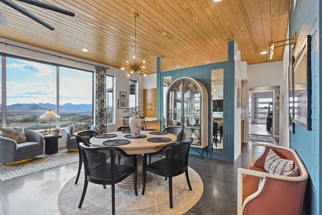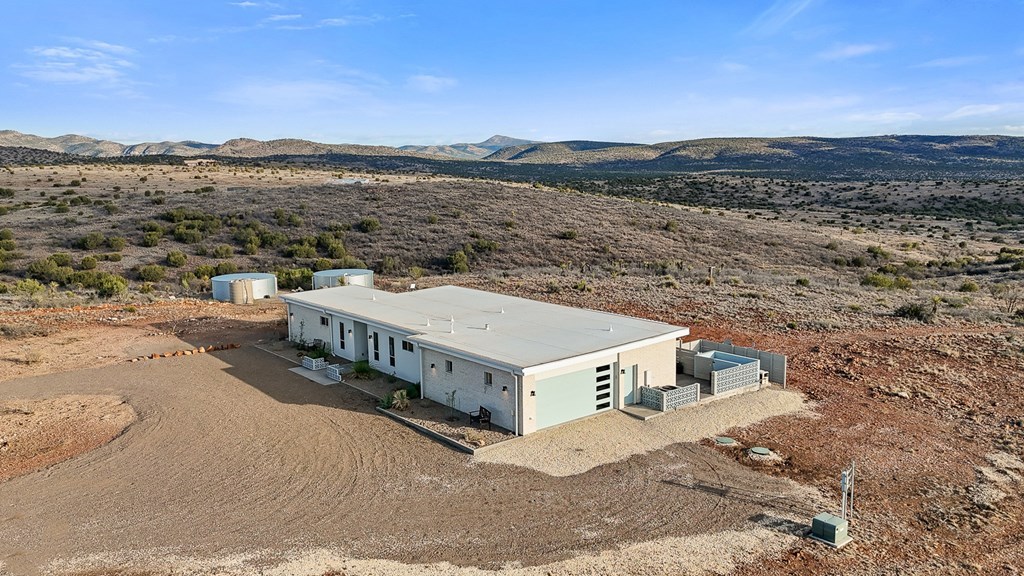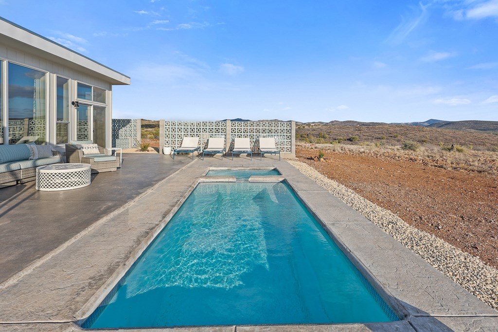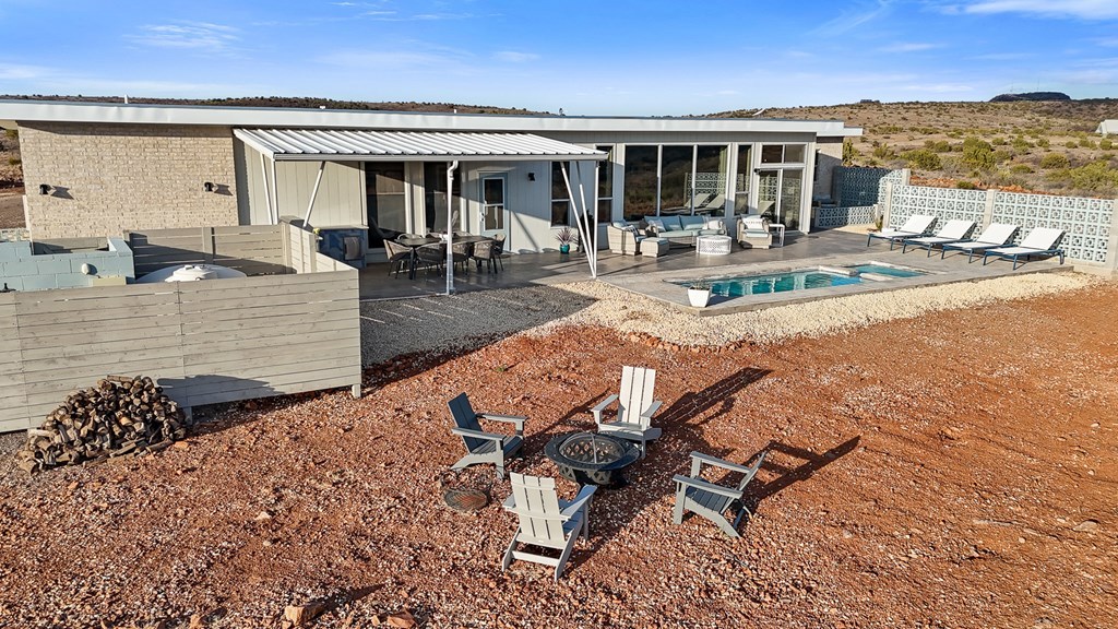 Fantastic midcentury home offering 360-degree mountain views. Polished concrete floors, tongue & groove ceilings, stainless appliances featuring an Iluve propane range, stylish lighting, quartz counters, and a wide variety of artists designed wallpapers. A wall of windows in the family-dining areas overlook the pool and spa, with a covered patio featuring an outdoor grill & bar area. Rainwater collection and a private well serve all your water needs. Giving Palm Springs vibes in West Texas.