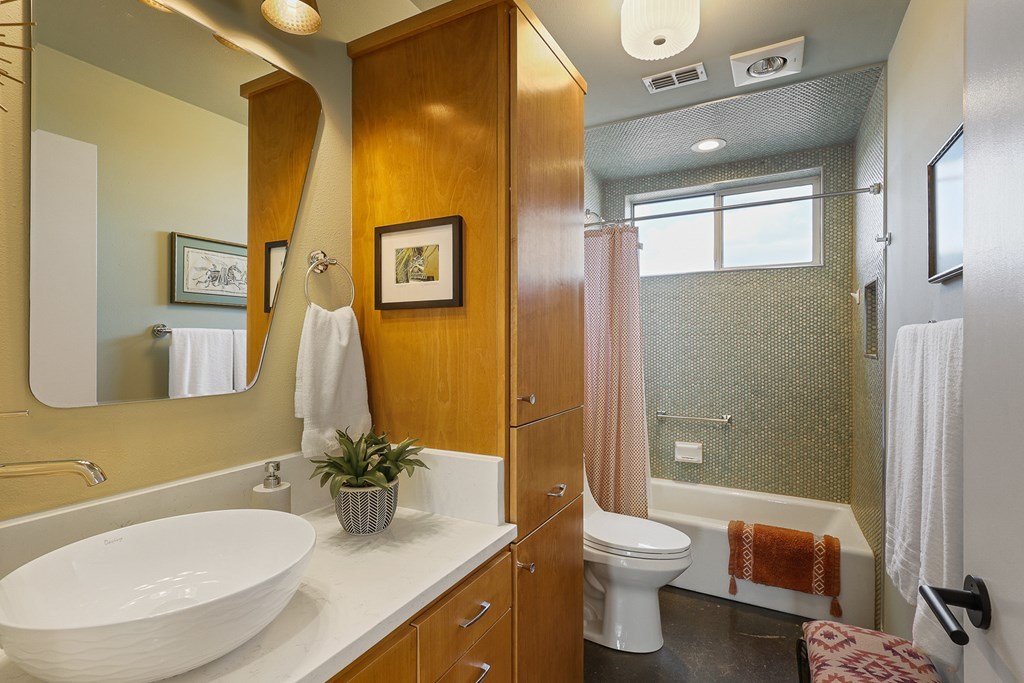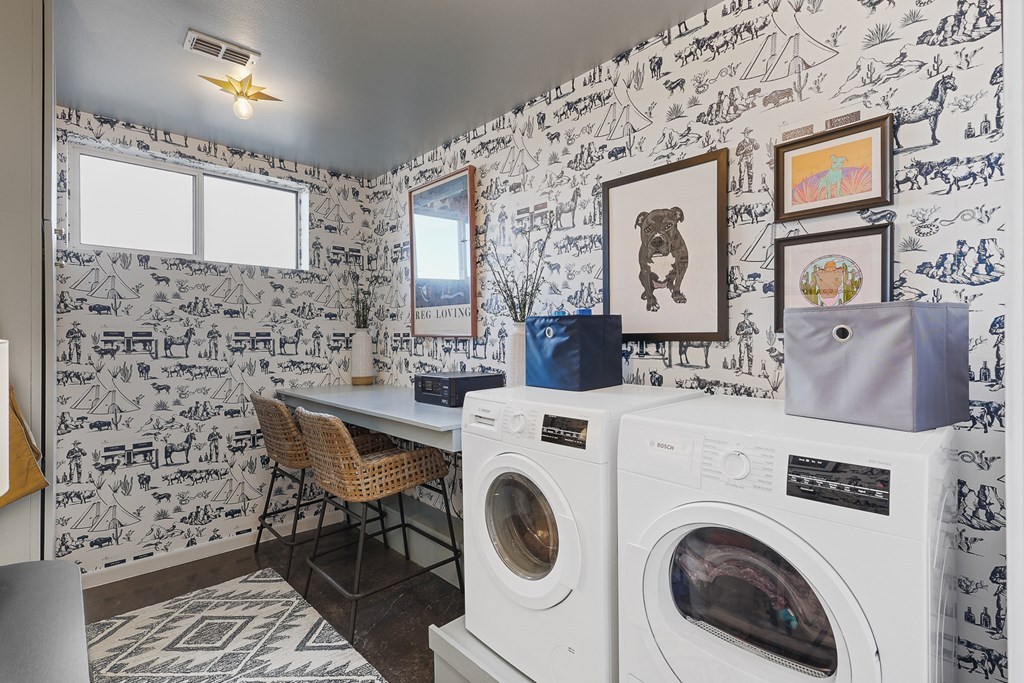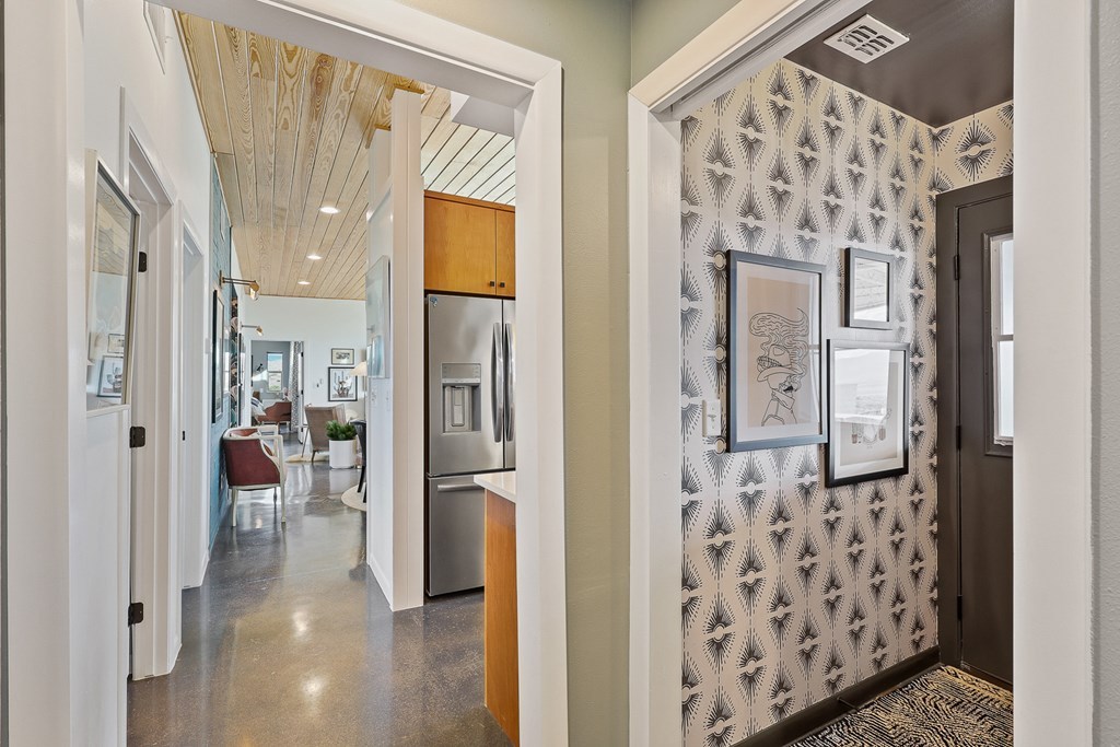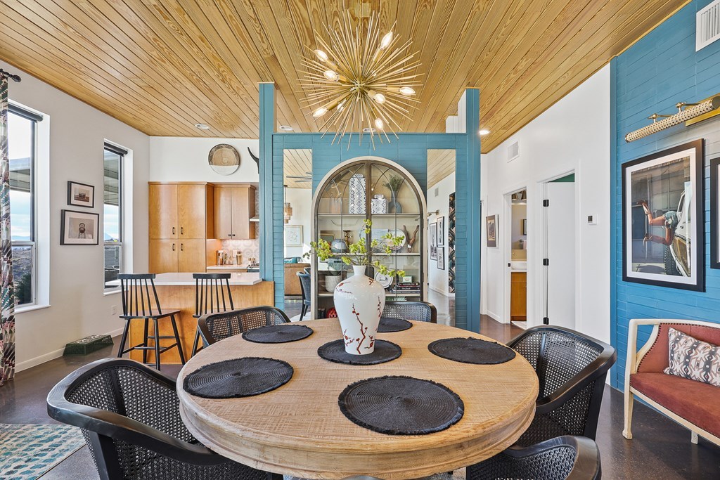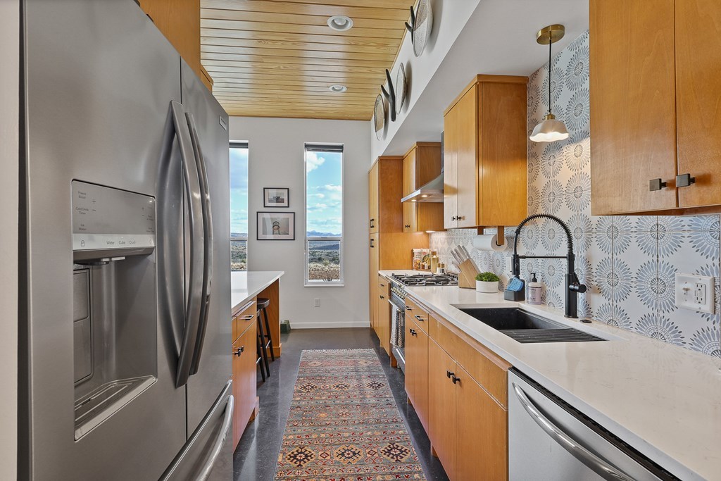 Fantastic midcentury home offering 360-degree mountain views. Polished concrete floors, tongue & groove ceilings, stainless appliances featuring an Iluve propane range, stylish lighting, quartz counters, and a wide variety of artists designed wallpapers. A wall of windows in the family-dining areas overlook the pool and spa, with a covered patio featuring an outdoor grill & bar area. Rainwater collection and a private well serve all your water needs. Giving Palm Springs vibes in West Texas.